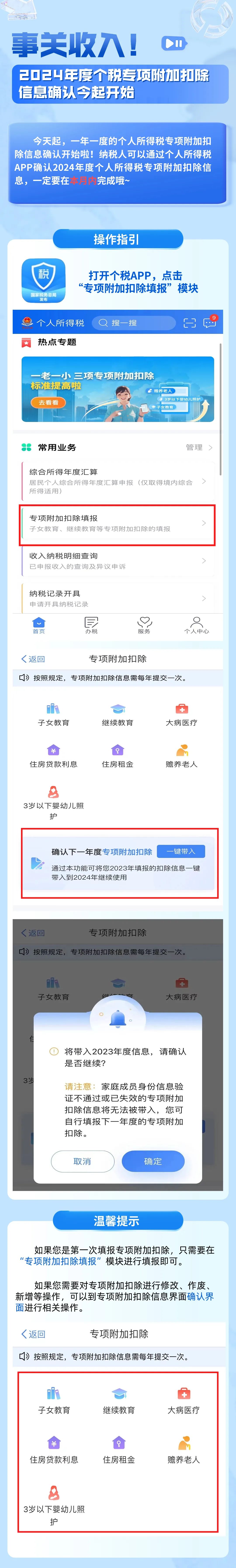 今天起,一年一度的個(gè)人所得稅專項(xiàng)附加扣除信息確認(rèn)開(kāi)始啦!納稅人可以通過(guò)個(gè)人所得稅APP確認(rèn)2024年度個(gè)人所得稅專項(xiàng)附加扣除信息,一定要在本月內(nèi)完成哦~